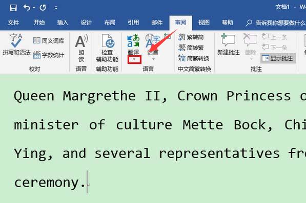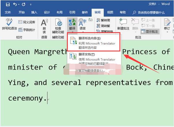 Word2019划词翻译在哪?审阅——翻译下边的向下箭头,选择"翻译所选内容"。