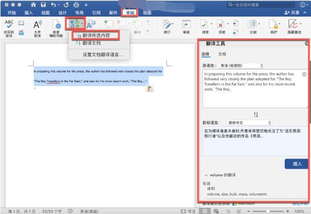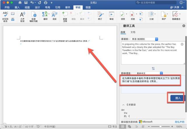 选择"插入"。 已翻译的文字将替换在步骤 1 中突出显示的文字。