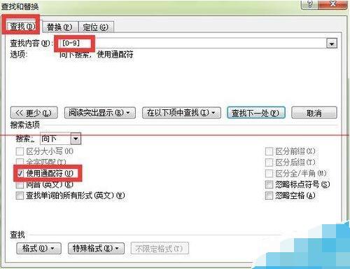 3、进入查找的页面后,在"查找内容"一栏输入【0-9】,意思是需要查找所有的数字,然后勾选下面"使用通配符"的选项。