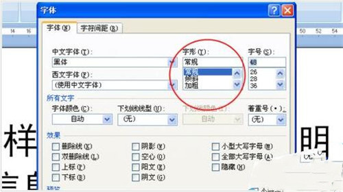 4、字形设置:在开始的对话框中进行字形的设置。如加粗,下划线,倾斜等。
