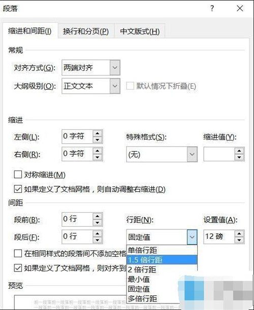 在" 段落 "设置页面内有" 行距 "一栏,单击下拉选单选中" 1.5倍行距 "(默认未单倍行距),当然你可以根据自己的实际需求进行设置修改,如"2倍行距",或者使用"固定值"设置自定义的行距即可,具体要根据自己Word文档的情况而定。小编在这里提醒,行距的设置尽量保证全文一致,否则看起来会非常别扭。
