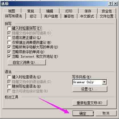 6、若想恢复原来的拼写检查,可以在菜单栏上点"工具"再点"选项",弹出的操作框中,把步骤4里取消的勾重新打上勾,再点确定。