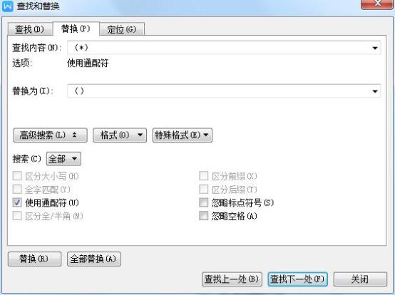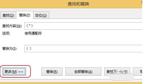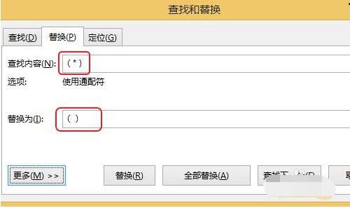 在弹出的窗口中在查找内容中输入"(*)",替换为中输入"()",如下图所示