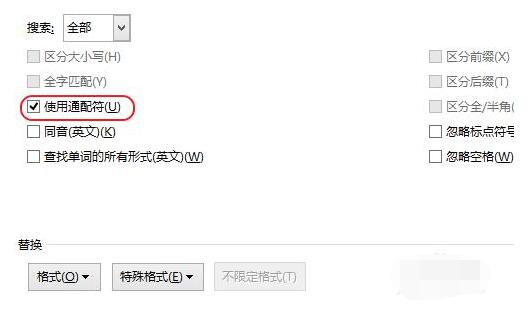 输入成功后,我们需要设置"使用通配符",点击"更多(M)"选项,有的Word版本点击"高级搜索(L)"。