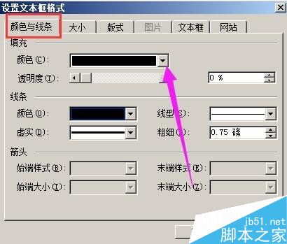 3、然后,光标放在文本框上,鼠标右键点击下,弹出设置框,点开"颜色与线条",在填充"颜色 "这里的三角形点下。如图所示。