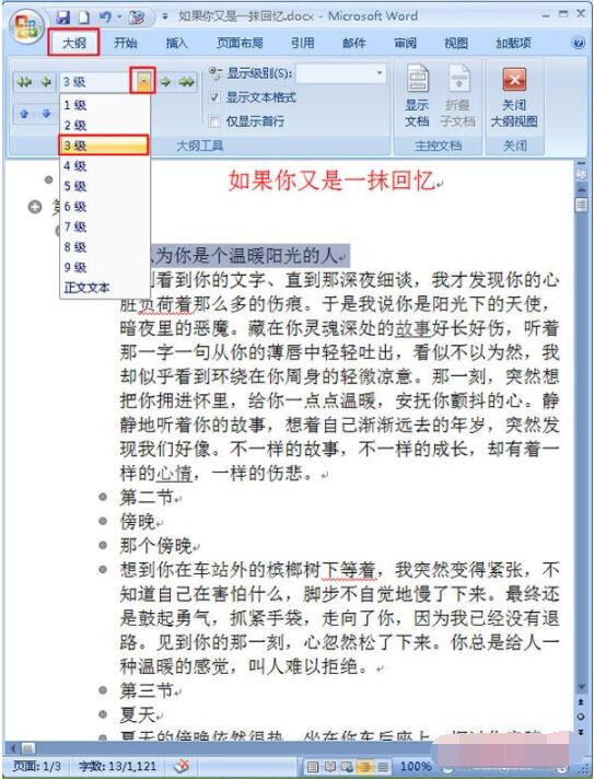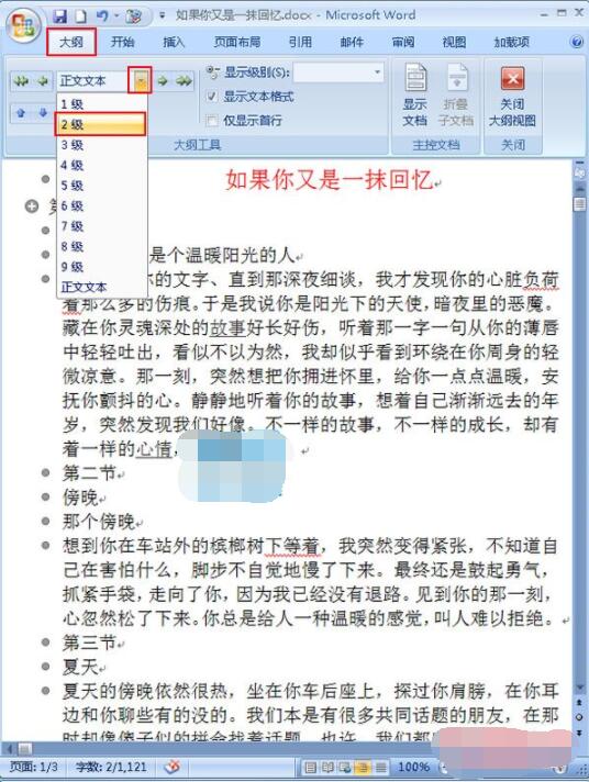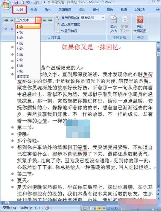 2.在"大纲"选项卡功能区域,我们需要把生成目录的标题进行一个级别的划分,选中文章中的主标题,单击"正文文本"后面的下拉按钮,在弹出的下拉菜单中选择"1级"命令,相应的依次轮推,选中副标题设置为2级,小标题为3级等,具体的做法如下图;