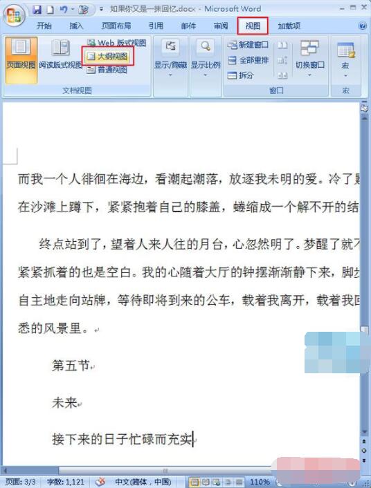 1.首先打开一篇需要自动生成目录的Word原始文档,单击"视图"选项卡,选择"文档视图"中的"大纲视图"选项组;