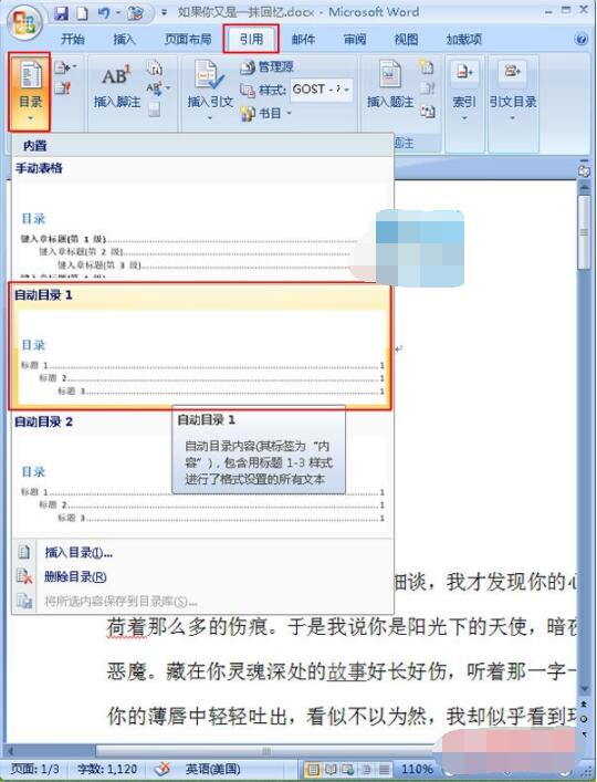 5.关闭后返回到页面视图中,我们将光标定位在需要添加目录的地方,小编在这里先将其定位在顶部,之后单击"引用"选项卡,在"目录"区域单击"目录"选项组,在弹出的下拉菜单中选择"自动目录1"命令;