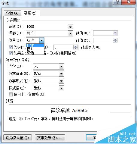 3、在选择"字体"选项后,弹出来的对话框,点击"高级"选项,下面蓝色方框处,"位置"选项后面,下拉选择"标准"点击"确定"之后,你在回到文档,是否发现鼠标变回正常状态了。