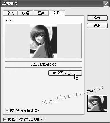 选中此图形,单击绘图工具栏的"填充色→填充效果…",在"图片"选项卡中单击"选择图片…" 按钮打开要进行裁剪的图形文件,并同时选中"锁定图片纵横比"和"随图形旋转填充效果"选项(见图3)以保证图片不因旋转或调整尺寸而失真、变形。确定后 可以看到图片己被裁成心形。