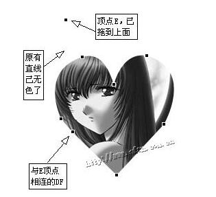 右击裁好的图形,选择"编辑顶点",拖动顶点E就可以直接调整裁图的位置和缩放比例。把E点向 左拖动则裁图区将向右移动并放大,向右拖则左移,同样还可以上下移动。不过要调整整体尺寸的话还得退出"编辑顶点"状态才能看到图形的尺寸柄。在此,拖动 调整后连接E-DF点的线就有点刺眼了,我们可以通过把图形边线设置为"无线条颜色"来消除它。最后的效果如图4。