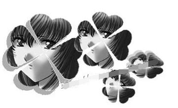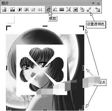 插入要裁剪的图片,选中,单击图片工具栏上的"文字环绕"选择"浮于文字上方"。单击工具栏上 的"四叶草裁图"按钮插入模板,拖到图片上你想要裁剪的位置(见图7),适当调整遮罩的大小。选中图片,单击"图片"工具栏的"裁剪"按钮,拖动裁剪控点 把超出模板的部分裁掉。同时选中模板和图片,剪切,"选择性粘贴"为"图片(png)",再选中这图片,用"设置透明色"把图片中的白色设置成透明,这样 就完成了四叶草形的裁剪。对于裁剪好的图片还是照样可以设置阴影、旋转等(见图8)。