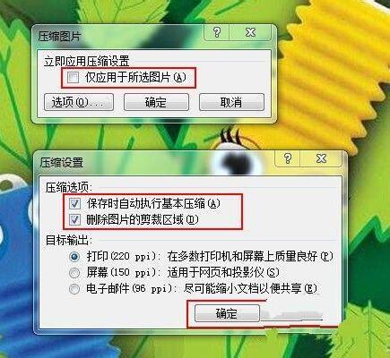 在弹出的"压缩图片"对话框中,确保"仅用于所选图片"未被选中,然后点击"选项。。。"打开"压缩设置"窗口,确保选中"保存时自动执行基本压缩"和"删除图片的剪切区域"两项,点击"确定"完成设置。保存保存文档。