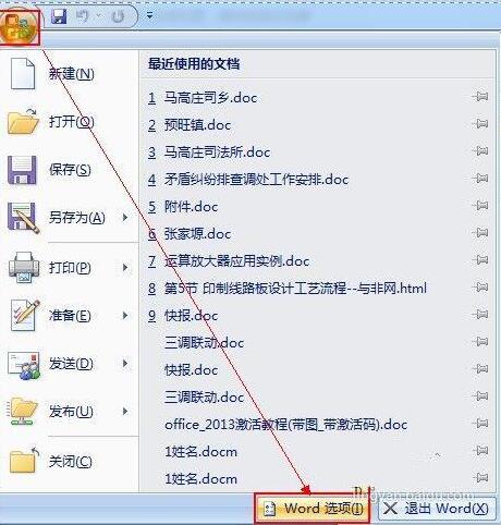 word2007版本中打开Word文档,点击"最左上角的Office的圆盘图标"→"Word选项"。