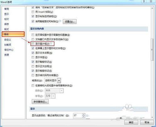 在打开的"Word选项"对话框中,点击左侧的"高级"选项卡,在右侧找到"显示文档内容"栏目,取消勾选"显示图片框"。