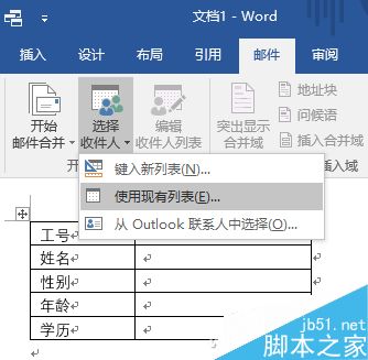 切换到"邮件"选项卡,点击"选择收件人"下的三角按钮,选择"使用现有列表",在打开对话框中,选择上面所创建的Excel的员工数据表后,点击"确定"。