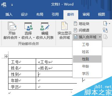现在分别将光标插入右侧对应的单元格中,再点击"插入合并域",选择插入相应的域。
