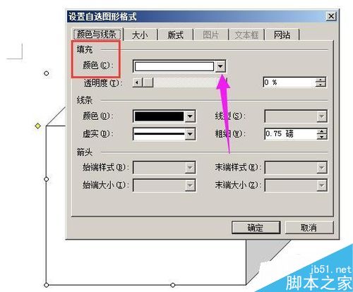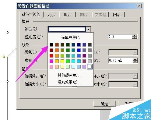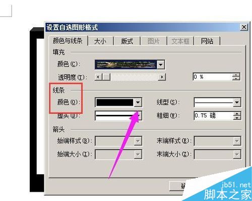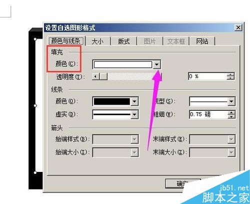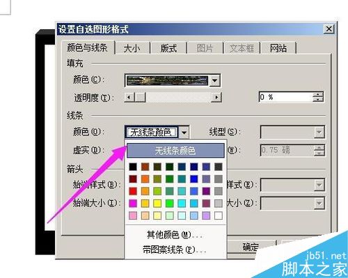 8、点确定后,转回到"线条与颜色"操作框,在"线条颜色"这里的三角形点下,弹出的菜单中点"无线条颜色"。然后再点确定,效果如图中所示。