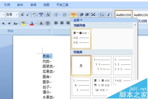 2、选择一级标题,这里我们选择美食,下面都是美食的分类。所以美食是一级标题。在段落中选择一个列表,这里我选择了默认。