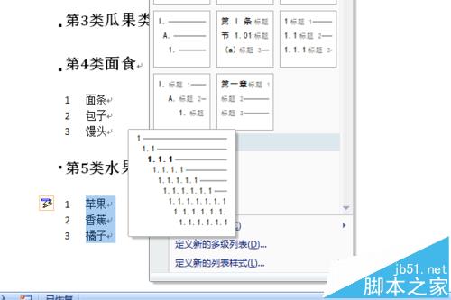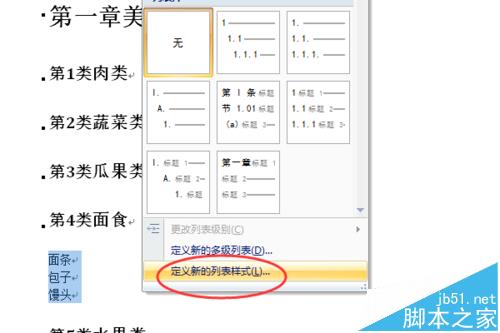 4、美食使用的是默认的列表样式,我们可以自定义列表样式,同样是在段落中选择,我们单击定义新的多级列表。