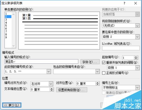 5、点开定义新多级列表后,打开一个窗口进行设置。我们选择级别列表中的2,对第2级别进行设置。然后编号样式选择1、 2、 3、 的样式,然后在编号格式的1前后输入 第 类,变成第1类的格式。然后点更多按钮,要在库中显示的级别我们选择2。级别样式连接到标题2