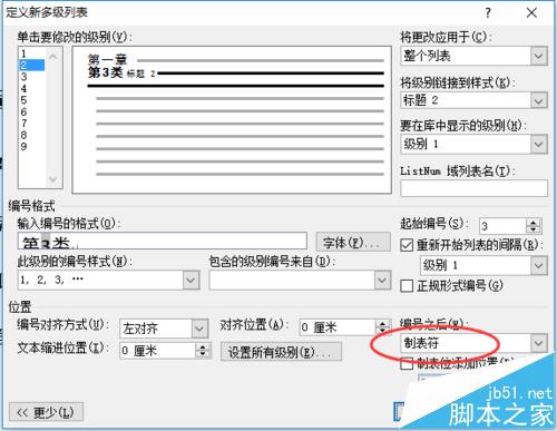 12、现在基本工作已经完成了,但是发现标题中第一章第一类与标题的名字挨着很近,我们再设置一下。在"定义新多级列表"中,标号之后加一个制表符。
