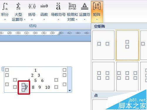 7、在更改好的两行中分别输入"4、5、6"与"7、8、9、10"。选中"7"所在的输入框光标移至"7"前,添加"2×1空矩阵"。