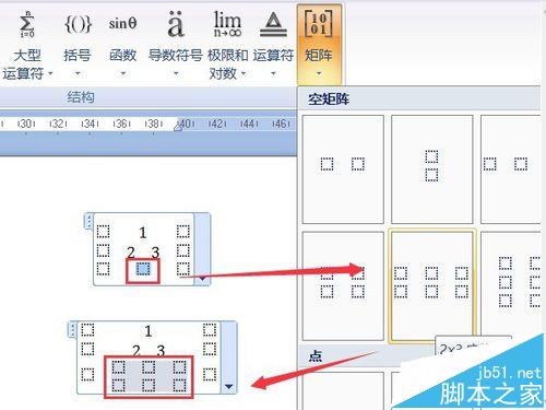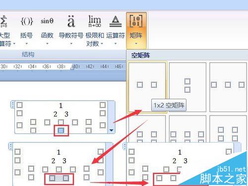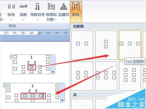 5、然后,选择新矩阵中间一格,在矩阵列表中选择"1×3空矩阵",将此行变为五格。