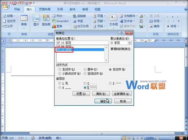 5、现在我们的裁剪线的前半部分已经做好了,后半部分的制作和前半部分一样,双击制表位,不过这次选择的是37.13字符,前导符还是选5号,确定。