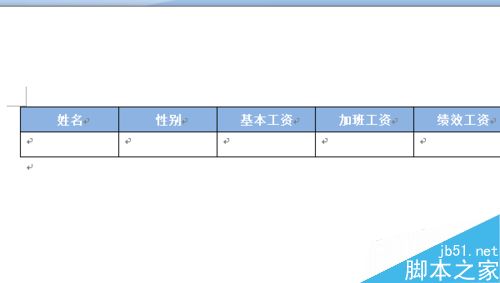 2、打开word,制作我们的工资条。表头与excel中的一致。这里将表头进行了设置,底纹设置成蓝色,字体设置成白色,并且水平居中、垂直居中。这些设置比较简单。