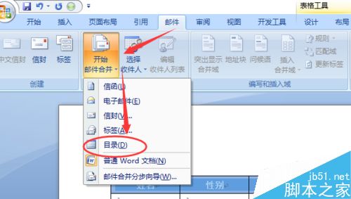 3、打开邮件选项卡找到开始邮件合并按钮,单击其下面的目录按钮。