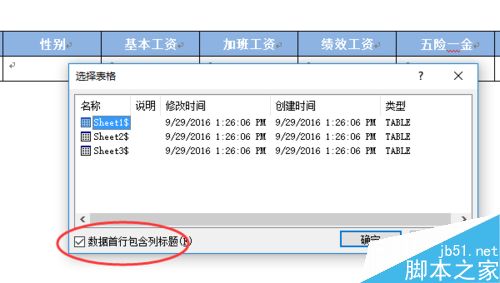 6、在弹出的选择表格窗口中,选择sheet1,勾选上数据首行包含列标题。单击确定按钮