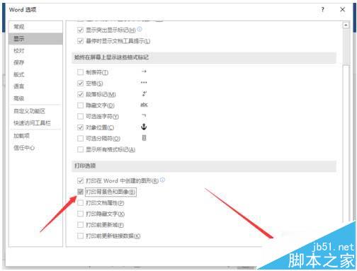 6、在"显示"选项卡栏的右侧窗格中,找到"打印选项"区域下的"答应背景色和图像"选项,并将其勾选即可。如图所示;
