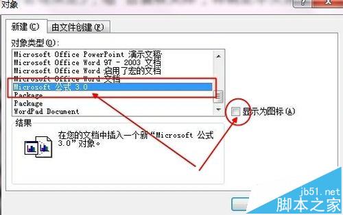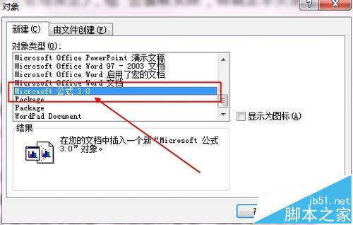 3、弹出了一个对象选择框。将下拉条往下拉,找到"Microsoft 公式 3.0 "单击选定它,确定。