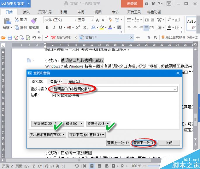 注:本文以WPS截图,Word中的操作类似。其中Word中虽在"开始→编辑"一栏中标示了Ctrl+F为文件内容查找的快捷键,但当按下该功能组合键后显示如下界面,搜索面更广。
