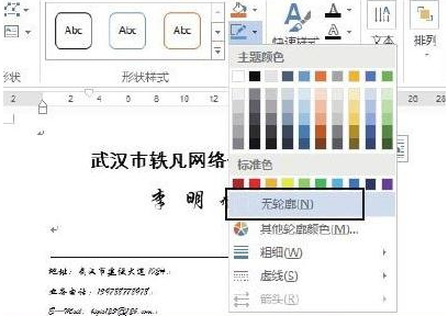 Word2013制作名片步骤4:在"绘图工具—格式"选项卡的"形状样式"组中单击"形状轮廓"按钮上的下三角按钮,在打开的下拉列表中选择"无轮廓"选项取消文本框的边框,如图4所示。