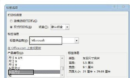 Word2013制作名片步骤6:打开"标签选项"对话框,在"标签供应商"下拉列表中选择"Microsoft",在"产品编号"列表框中选择需要使用的名片样式,然后单击"确定"按钮关闭对话框,如图6所示。