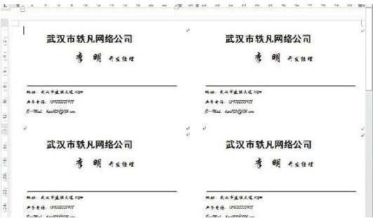 Word2013制作名片步骤9:此时,文本框将作为图片粘贴到单元格中,拖动图片框上的控制柄对图片的大小进行调整,使之与单元格的大小相配。然后将第一个单元格中的图片粘贴到其他的单元格中,并调整它们的大小和位置。保存文档,在整个页面中添加名片后的效果如图10所示。