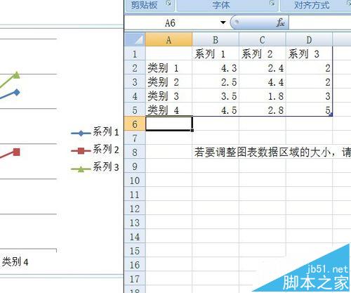 3、确定后,弹出折线图与数据表。其中系列对应的是折线,类别对应的是折线中的数据,即折线中的关键点。本例中有三个班级和一个总评,所以,还需要添加一列。