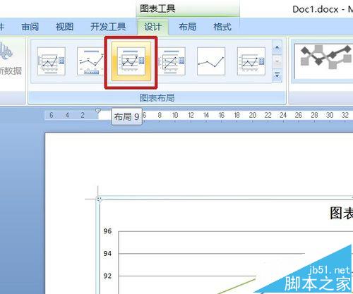 9、在图表工具——设计中,为折线图选择一个满意的布局,我选择了布局9,这是一个带数值标示和标题的布局。选择后,每个数值自动出现在图表中。如果预设的布局没有满意的,只有自己添加文本框来设计布局了。