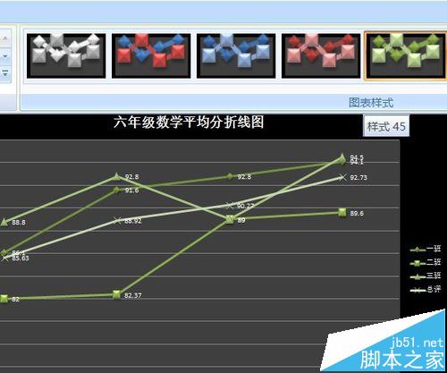 12、完成后的折线图。在图表工具——设计——图表样式中,有许多预设的样式,包含底色即线条粗细、颜色及文字样式的设定。试一下,或者有你满意的效果。当然,也可以自己设置喜欢的样式。