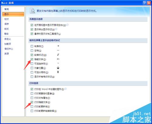 5、在对话框找到显示选项,勾选隐藏文字和打印隐藏文字。