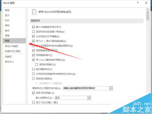 5、在"Word选项"对话窗口中,将选项卡切换到"高级"选项卡栏。如图所示;