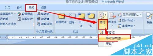 2、依次点击 审阅,修订下的三角,然后点击 修订选项: