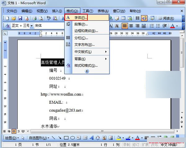 启动Word2003,鼠标选中需要进行"隐藏"的文字,单击菜单栏--格式--字体。