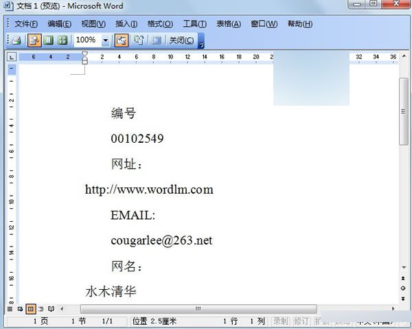 我们打印预览看看,并没有将这一行文字打印出来,于是,实现了本文开头所示的目的。