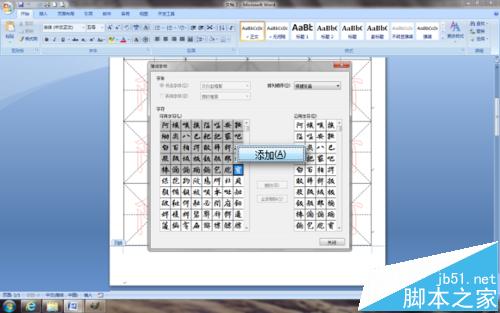 3、选中部分书法汉字,点击中间的"添加"按钮,被选中的汉字即被复制到右侧的"已用字符"表中。