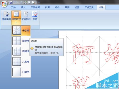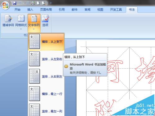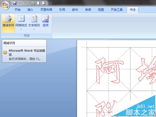 5、Word 还为书法页面设置了"书法"选项卡。点击该选项卡,会发现其中放置了"增减字符"、"网格样式"、"文字排列"、"选项"四个按钮。