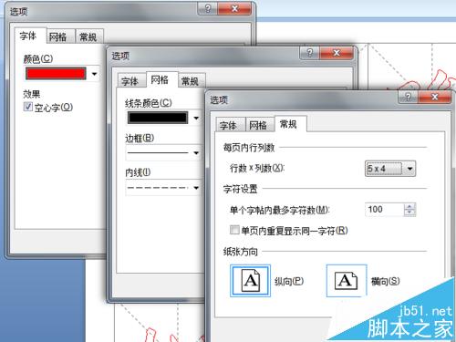 8、点击"选项"按钮,会弹出"选项"对话框,其中有"字体"、"网格"、"常规"三个选项卡,可以对字体颜色、网格线型、汉字数目等进行设置。其中常规选项卡中,有一项"单页内重复显示同一字符",选中它可以在一个书法页面上填充一个汉字,方便反复练习。