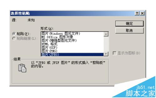 有时我们点击选择性粘贴之后没有"图片(JPEG)"选项,这时我们随便选一项点击确定,然后复制粘贴的图片,再选择"选择性粘贴"。